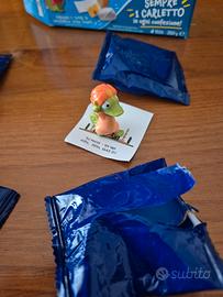 Sorprese complete di cartina e bustina blu. Comprese nel prezzo anche due scatole vuote celebrative dei sofficini (formaggi e spinaci) che raffigurano i vari personaggi di "Carletto".