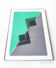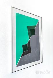 Serigrafia originale di Carmelo Cappello realizzata nel 1978, caratterizzata da una rigorosa composizione geometrica di matrice costruttivista, con campiture cromatiche nette e volumi prospettici essenziali. L’opera presenta un impianto visivo minimale e strutturato, in cui lo spazio è definito attraverso piani sovrapposti e contrasti tonali, in piena coerenza con la ricerca plastica dell’artista. Esemplare completo di timbro a secco “Edizioni Arte Struktura”, firmato e datato al retro. In cornice di alluminio Nielsen.