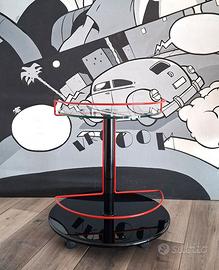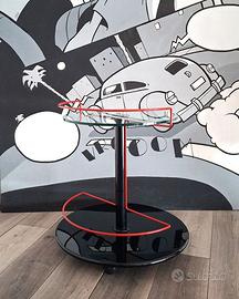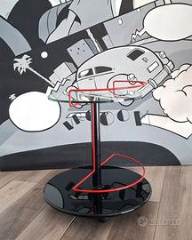Carrello bar postmoderno anni '80. Base inferiore in legno laccato nero, tubolare in ferro rosso e piano in vetro. Dotato di 4 ruote che ne facilitano lo spostamento. Buone condizioni. Dimensioni: diametro totale cm. 60, altezza cm. 66. Trasporto da concordare