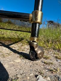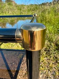 Vendo un raffinato carrello bar vintage, un classico esempio di design della metà del XX secolo (anni '70/'80) in stile Hollywood Regency. * Struttura: Metallo tubolare nero con giunzioni e dettagli decorativi in ottone dorato. * Ripiani: Due livelli in vetro fumé scuro, tipico dell'estetica dell'epoca. * Mobilità: Ruote sferiche in metallo che ne facilitano lo spostamento per il servizio. Misure: cm. 80,5 x 45,5 x h 50 Ottime condizioni (qualche piccolissimo segno dovuto al normale uso); vetri non scheggiati. Prezzo 150€. Si trova a Morsano al Tagliamento (PN). Posso spedire, ma è preferibile la consegna/ritiro a mano vista la presenza dei vetri. Post presente in più gruppi.