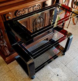 Il design si distingue per Struttura in plastica nera lucida (spesso ABS o materiali simili tipici dell'epoca) e ripiani invetro fumécon serigrafie a righe.