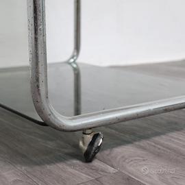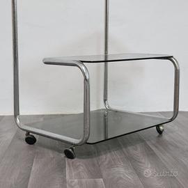 Elegante carrello portavivande degli anni ’70, realizzato in acciaio cromato con tre ripiani in vetro fumé. Il design sinuoso e minimale richiama lo stile modernista tipico del periodo, con struttura tubolare continua e angoli morbidi che conferiscono leggerezza visiva e funzionalità.