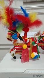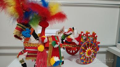 Prezzo trattabile. In legno lavorato artigianalmente e dipinto a mano. Misure base 35x12. Altezza 28. Uno dei simboli più caratteristici della Sicilia che richiama alla memoria il florido commercio, la cultura tipica e l’arte originalissima della Sicilia. Il manufatto riproduce la tradizionale usanza siciliana di adornare ed abbellire il carretto ed il suo cavallo da traino in occasione delle feste.