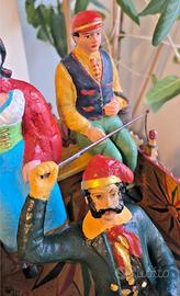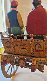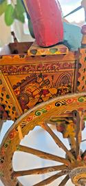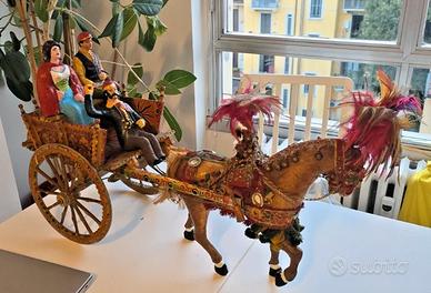 Materiali: struttura, ruote e cavallo in legno, dipinto a mano. Personaggi (“pupi”) a bordo in terracotta dipinta.