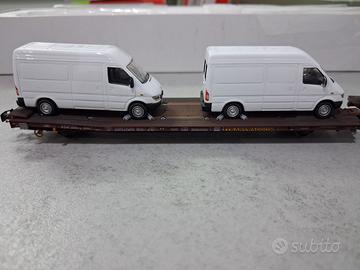 Vendo 4 carri Laads 800B della Hobby Trade. I carri sono sporcati e caricati con furgoni Mercedes Sprinter della Model Power e hanno marcature numeriche differenti. Solo ad un carro manca un respingente.