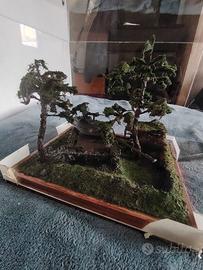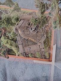 Modellino fatto a mano, carro armato in scala 1:35 chiuso in teca di plexiglass con vegetazione attorno e 3 soldati. Base in legno misure 30x23.5 cm. Disponibili altre foto.