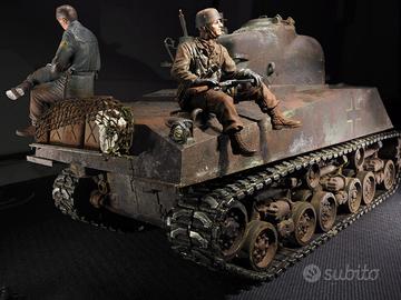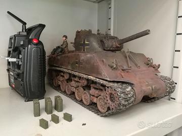 Carro Armato 1/16 R/C M4 SHERMAN 105mm HOWITZER Full Motion al kit 56048 sono stai eseguiti i seguenti upgrade: - cingoli in metallo - kit metallo torretta - sostituiti motori trazione (originali sono troppo veloci) - sistema di ricarico on board Completo di radio e figurini Il Progetto Decima è la riproduzione di un carro armato Sherman M4 Beute Panzer. Il carro si inserisce nello scenario degli scontri avvenuti alle porte di Roma (Castello di Decima) nel maggio 1944 tra le forze alleate da un lato e la 29ª Divisione Panzergrenadier (Divisione Falco) dall'altro, fianco a fianco con i paracadutisti del 185º Battaglione Nembo. Il carro armato fu catturato durante lo sbarco di Anzio e utilizzato per la difesa di Roma. A bordo troviamo un ufficiale paracadutista e un soldato tedesco. Sulla cassa di trasporto sono presenti foto dei combattimenti di Cassino, dello sbarco di Anzio e mappe del territorio dell'epoca. Loghi dell'Istituto Leggero e dell'UFA (equivalente tedesco) sui lati della cassa di trasporto. Spedisco ma preferirei consegna a mano. Spedizione a rischio dell'acquirente. Posso imballare benissimo ma si tratta di un oggetto delicato.