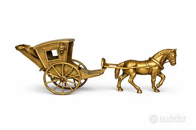 Affascinante scultura decorativa raffigurante una carrozza trainata da cavallo, realizzata in metallo ottone color oro, ricca di dettagli e dal forte gusto classico e vintage.