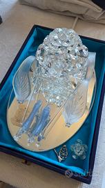 Pezzo di grande pregio, lavorato a mano, con elementi in cristallo sfaccettato e cavalli in vetro artistico. La base è specchiata e l’oggetto è custodito nella scatola originale con interno in raso azzurro.