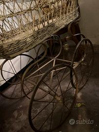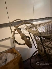 carrozzina vintage fine 1800 originale in ferro e giunco o rattan con manici a ricciolo e ruote grandi in ferro