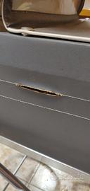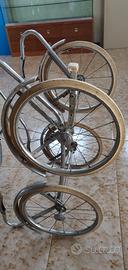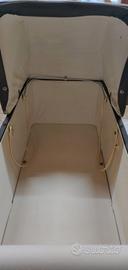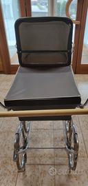 Carrozzina vintage anni '60 in pelle grigia con finiture e cuciture bianche. Azienda produttrice: PEG Perego. Struttura e telaio ben conservati. Un segno di usura in cucitura laterale, vedi foto allegata.