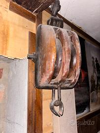 Affascinante carrucola antica in legno massello, probabilmente appartenuta a una grande barca a vela d’epoca, risalente ai primi del ‘900 o fine Ottocento. Le sue generose dimensioni (simili a un pallone da calcio) e il peso importante testimoniano la sua funzione originale in ambito nautico, probabilmente per vele o carichi pesanti.