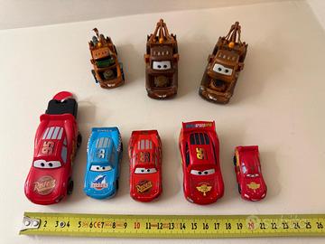 Vendo n. 8 macchinine del film Cars, personaggi Saetta e Cricchetto, in plastica o metallo di varie dimensioni: la più piccola 5x2 cm, altezza 2 cm; la più grande 8x4 cm, altezza 4 cm. Una macchinina di Saetta è dotata di chiavetta di lancio. SOLO 2 macchinine di Saetta, la più grande con chiavetta e la più piccola sono in plastica, tutte le altre sono in metallo.