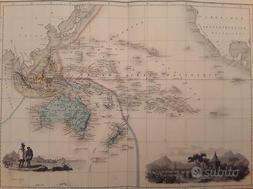 Bella carta geografica antica di metà Ottocento dell'Oceania, colorata e con piccole raffigurazioni. Misura cm 47,5x35