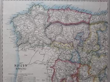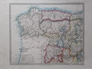 Bella originale carta geografica colorata dell'Ottocento della Spagna, pubblicata da Baldwin and Cradock nel 1831. Misura cm. 41x33,5.