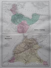 Carta geografica originale colorata di metà Ottocento della Tunisia e dell'impero del Marocco di A.T. Chartier. Misura cm. 48,5x35