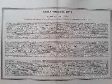 Rappresentazione del mondo sotto forma di tre pannelli orizzontali, riproduzione del primo famoso manoscritto, chiamato Tabula Peutingeriana, della Biblioteca imperiale di Vienna. La carta mostra la conoscenza da parte dei Romani del proprio Impero e delle strade romane dall'India all'Europa occidentale. Pubblicata da M. J.-J.-N. Huot 1838. Misura cm. 54,5x39