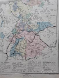 Carta geografica fisica e politica originale dell'Ottocento della Confederazione Germanica, situazione degli stati secondari dal 1815 al 1866. Misura cm. 34x24
