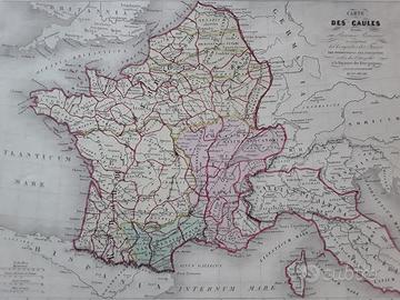 Carta geografica di metà Ottocento delle Gallie divise in province Romane, comprendente le conquiste dei Franchi e i possedimenti dei Visigoti. Le linee di confine colorate a mano all'epoca. Misura cm. 38,5x27