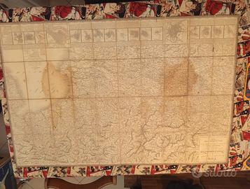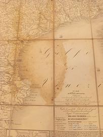 Incisione in rame, dipinta d’epoca, mm 850x1310, montata su tela verde coeva. Terza edizione della carta, originariamente pubblicata nel 1845 e poi ristampata nel 1848. Nella parte inferiore vengono riprodotte le piante dei 17 capoluoghi di provincia del regno con notizie statistiche. Buone condizioni. Prezzo trattabile
