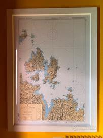 Bellissima carta nautica dettagliata dell’arcipelago della Maddalena in scala 1:25000, con cornice in legno bianco opaco realizzata su misura. Condizioni perfette, pari al nuovo. Misure della cornice: lato corto 96,5 cm; lato lungo 132 cm.