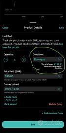Per trasparenza, allego gli screen dei prezzi per la carta nuova (nel primo screen), del prezzo di quella danneggiata, nelle peggiori condizioni possibili (secondo screen) e prezzo di CM nel terzo. Sempre nel terzo, in basso, altri prezzi di inserzioni di un altro sito di vendite.