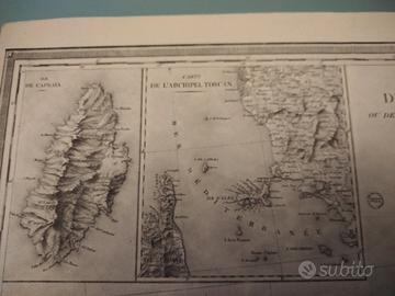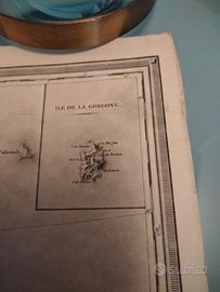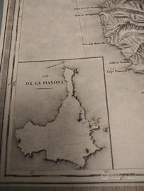 Antica e dettagliata mappa su pergamena originale geo- topografica dell' arcipelago toscano ( isola d'Elba e isole adiacenti ) pubblicata 1821 dal Depot de la Guerre . È stata creata su rilievi militari francesi tra il 1802/1803 dal ministro della Guerra.