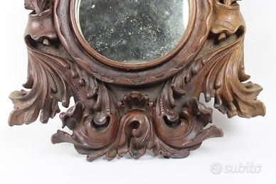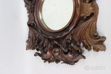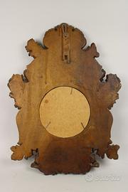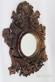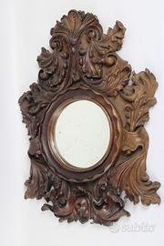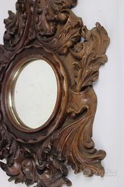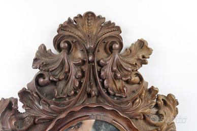 Preziosa ed elaborata cartagloria interamente scolpita a cartoccio su legno di noce. Riproduce il classico motivo con intagli a volute silvestri e fogliacee.