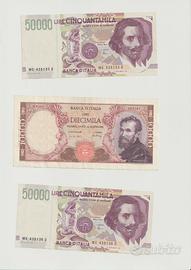 Vendo preferibilmente in blocco lotto di banconote della Repubblica Italiana. Le due 50 mila Bernini secondo tipo in quasi FDS, la 10 mila di Michelangelo in SPL. Presente nel lotto anche una Bellini serie speciale XD e altri due pezzi da 1.000 lire Marco Polo e Montessori in stato di conservazione inferiore.