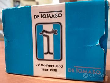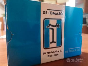 Carte da gioco Dal Negro in collaborazione con De Tomaso per il 30° anniversario (1959-1989). Carte commemorative tenute in perfetto stato, mentre la scatola presenta svariati difetti e strappi dovuti al tempo e alle condizioni dell'ambiente nelle quali è stata conservata. Oggetto da collezione adatto anche al gioco, di ottima qualità.