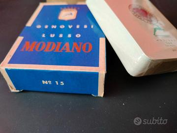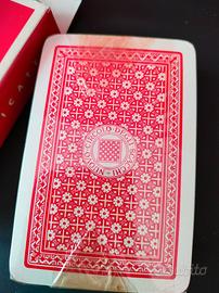 Coppia di mazzo di carte vintage, rosse e blu, della modiano del 1970 con bollo di stato italiano (lire 300). Ogni mazzo ha 52 carte da gioco del tipo genovesi. Ancora sigillate e chiuse, erano state fabbricate appositamente per lo storico nuovo circolo degli scacchi di Roma (vedi retro mazzo).
