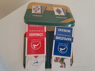 Carte da gioco plastificate Modiano in elegante scatola. Le lombarde nel loro imballo, le napoletane prive di incarto in plastica.