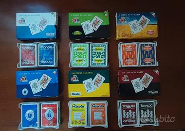 Vendo in blocco 22 doppi mazzi di carte da gioco pubblicitarie ( varie pubblicità:RICOLA,CAFFÈ MOTTA,MONGE...)tutte nuove e celofanate