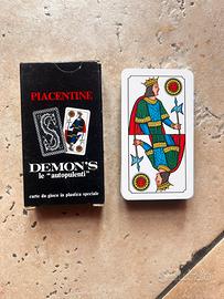 Piacentine DEMON'S Le carte da gioco DEMON'S, sono carte altamente professionali. Sono dotate di una eccezionale scorrevolezza che inizialmente può sorprendere i giocatori abituati alle carte tradizionali. Questa caratteristica, che si conserva nel tempo, sarà sempre più apprezzata dal giocatore esigente. Le carte DEMON'S sono definite "le autopulenti" perchè realizzate in plastica speciale, non assorbono lo sporco ma si autopuliscono durante le normali operazioni di gioco. Anno 1978