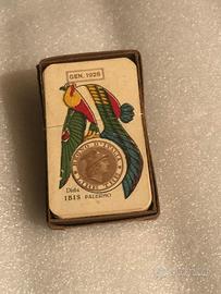 Mazzo di carte da gioco siciliane d’epoca del Regno d’Italia mai usate. Prodotto dalla ditta Ibis di Palermo nel gennaio 1928 con relativa scatola di cartone.
