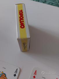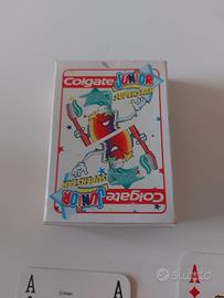 carte da gioco vintage "Colgate Junior Superstar", distribuito in collaborazione con Walt Disney e allegato al settimanale Topolino nel 1991. Le carte sono state realizzate dalla storica azienda Modiano, sinonimo di qualità e resistenza. Un vero pezzo di storia del collezionismo Disney anni '90! Caratteristiche del mazzo: Anno: 1991 (Vintage). Condizioni: Ottime, carte ben conservate (come da foto). Completezza: Mazzo completo di 52 carte + 2 Jolly (Joker raffiguranti il personaggio Colgate). Incluso: Scatolina originale dell'epoca inclusa. Dettagli: Figure personalizzate con i personaggi classici (Topolino, Paperino, Minni, Pippo). Un oggetto imperdibile per i collezionisti di gadget di Topolino o per chi vuole rivivere i ricordi d'infanzia degli anni '90.