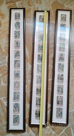 Incorniciate in legno scuro con un passe-partout bianco e bordo interno dorato e vetro in tre quadretti verticali larghi 14,5 cm, di altezza cm, 100 (due dei tre) e 105 cm .
