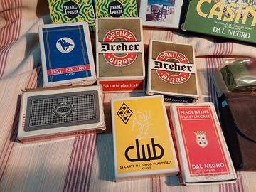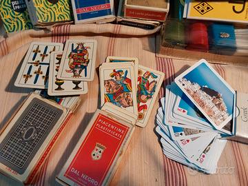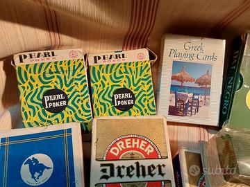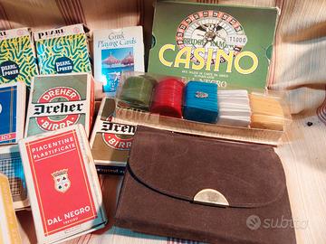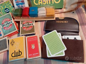 vendo mazzi vari di carte da poker,anche con foto della Grecia, da briscola,e fisch in plastica vari colori e forme. come da foto,ben tenute,con custodia pubblicitaria di banca s.paolo in finto camoscio marrone. alcune poco usate alcune un po di più ma utilizzabili.stock completo di 13 mazzi pi confezione fisch, come da foto. visibili a Modena. tutte da collezione.