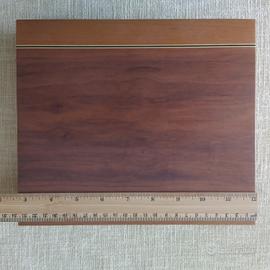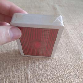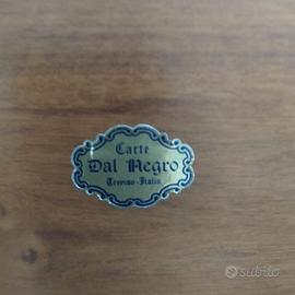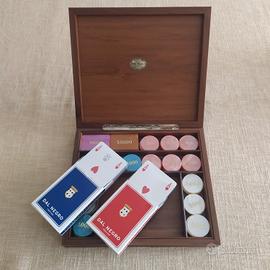 Cofanetto in legno con carte da poker (2 mazzi conservati nell'involucro in plastica originale) fisches vintage in vari tagli con effetto madreperlato. Realizzati dall'azienda Del Nero.