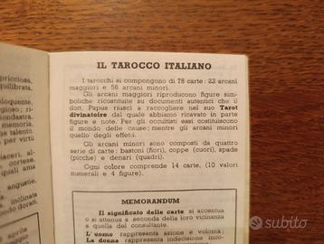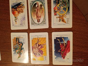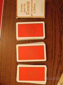 Carte per tarocchi con 22 arcani maggiori e 56 minori. In tutto 78 carte con libretto per istruzioni. Carte in perfette condizioni, custodia usurata.