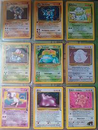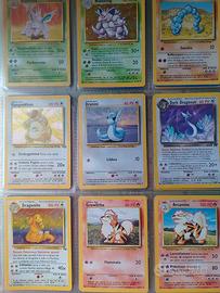 Vendo carte Pokemon vintage, risalenti alle prime edizioni degli anni 1999/2000, appartenenti al Set base, Fossil, Jungle e Team Rocket. Di varie rarità (1° ed, holo e non) e condizioni. Le più importanti: Dark Blastoise holo Team Rocket 3/82 Good Lapras Fossil 25/62 Excellent Gyarados holo Set base 6/102 Poor Kabutops Fossil 24/62 Good Pidgeotto Set base 22/102 Played Pidgeot holo Jungle 8/6 Poor Electrode holo Jungle 2/64 Near mint Zapdos Fossil 15/62 Excellent Dugtrio Set base 19/102 Near mint Charizard holo Set base 4/102 Excellent Machamp holo 1°ed Set base 8/102 Near mint Venusaur holoSet base 15/102 Near mint Chansey holo Set base 3/102 Near mint Ditto holo Fossil 3/62 Near mint Clefable 1°ed Jungle 17/64 Excellent Beedrill Set base 17/102 Excellent Gengar Fossil 20/62 Near mint Muk holo Fossil 13/62 Near mint Nidoqueen Jungle 23/64 Near mint Mr. Mime holo Jungle 6/64 Near mint Venomoth holo Jungle 13/64 Near mint Nidoking holo Set base 11/102 Near mint Kangaskhan holo Jungle 5/64 Near mint Dragonite holo Fossil 4/62 Near mint Raichu holo Fossil 14/62 Excellent Poliwrath holo Set base 13/102 Near mint Pinsir Jungle 25/64 Near mint Wigglytuff Jungle 16/64 Excellent Vaporeon holo Jungle 12/64 Excellent Flareon 1°ed Jungle 19/64 Near mint Ninetales holo Set base 12/102 Excellent Victreebel Jungle 30/64 Excellent Hitmonlee Fossil 22/62 Excellent Hitmonchan holo Set base 7/102 Poor Hypno Fossil 23/62 Good Dark Alakazam holo Team Rocket 1/82 Played Magneton holo Set base 9/102 Good Scyther Jungle 26/64 Good Aerodactyl Fossil 16/62 Near mint Snorlax holo Jungle 11/64 Near mint Ho anche comuni e non comuni. Ovviamente tutte originali (acquistate quando ero bambino). Preferisco vendere l'intera collezione in blocco. Ho cercato di valutare le condizioni in base alle offerte di altri venditori di altri siti.