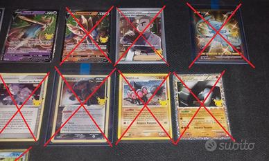 Vendo diverse carte dell'espansione speciale del gioco di carte collezionabili Pokèmon "Celebrations" in lingua italiana.