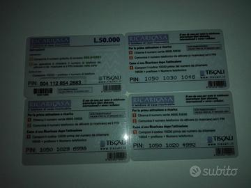 Cedo 4 tessere telefoniche prepagate Ricaricasa di Tiscali con scadenza 2001 - In perfetto stato di conservazione cedo solo in blocco a 5 euro + eventuali spese di spedizione da concordare.