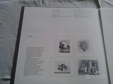 Cartella in speciale tiratura limitata (non numerata) di 8 acqueforti su rame di Giorgio Morandi (dal 1927 al 1961), riprodotte in fotolitografia, cm 43x33,5, Electa, Milano 1984. In un'asta di ArsValue del 2018 la cartella era stimata fra i 400 e i 500 euro.