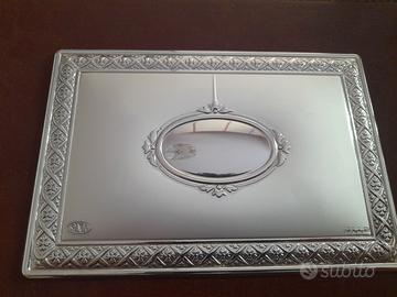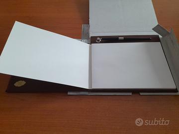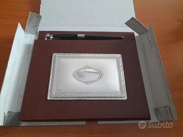 Vendo elegante cartella/portablocco in pelle con applicazione frontale in argento del marchio Sima Argenti e porta penna integrato con penna originale in dotazione, completo di scatolo originale. Mai utilizzato. La placca è in argento dimensioni 16x11 cm lavorata con decori classici. Oggetto ideale come complemento da scrivania o articolo da collezione. Dettagli: Marca: Sima Argenti Materiale: pelle + placca in argento Dimensioni placca: circa 16 x 11 cm Condizioni: ottime (come da foto) Completa di blocco note e penna Oggetto originale anni 2000, ben conservato. Vendo ad euro 69. Ritiro a mano su Salerno. Eventuale spedizione tracciata ad euro 9e aggiuntive previo bonifico o ricarica. Non spedisco tramite tuttosubito. PS: in altri miei annunci ho disponibilità di diverse penne da collezione di varie marche e prezzi, penna a sfera Aurora, penne stilografiche, penna a sfera Parker etc...