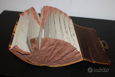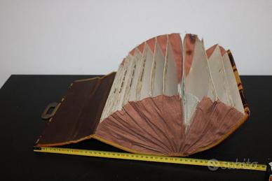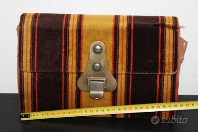 Originale cartella portadocumenti vintage risalente agli anni ’60, caratterizzata da una struttura a soffietto con più scomparti interni, ideale per organizzare documenti, lettere o piccoli oggetti. 🔸 Dimensioni Larghezza: circa 30 cm Profondità (chiusa): circa 12–15 cm Apertura a soffietto ampia (come da foto), con diversi comparti interni 🔸 Materiali e design La cartella è rivestita in tessuto vellutato a righe nei toni caldi del giallo, marrone e rosso/arancio, con un forte richiamo estetico vintage/retro tipico degli anni ’60. La chiusura frontale è in metallo, solida e dal design industriale, che aggiunge carattere e autenticità all’oggetto. L’interno è composto da scomparti a fisarmonica (soffietto) rivestiti in tessuto, perfetti per suddividere documenti o collezioni. ✨ Oggetto molto decorativo, ideale anche come elemento d’arredo per studi, librerie o ambienti vintage, oltre che utilizzabile come organizer originale. 🔸 Condizioni Oggetto autentico d’epoca, con segni evidenti del tempo e dell’uso: strappi e usura nel tessuto interno (visibili in foto) bordi e rivestimenti con segni di consumo carta interna con abrasioni e piccoli danni esterno nel complesso ancora ben conservato e molto scenografico 👉 Si segnala che le condizioni sono coerenti con l’età (circa 60 anni) e ne testimoniano l’autenticità. 🔸 Utilizzo Perfetta per: collezionisti di oggetti vintage arredamento retrò uso come organizer creativo shooting fotografici o scenografie 💡 Pezzo unico dal forte carattere estetico, difficile da trovare in questo stile tessile. 📦 Venduta come da foto.