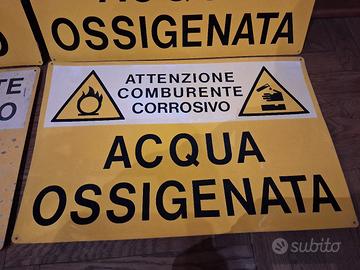 Cartelli industriali " acqua ossigenata, acido acetico, soda caustica ", in lamiera, misura 33 x 50 cm. Prezzo euro 15 cadauno targa,tabella, insegna, vintage, industrial design
