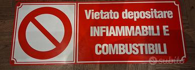 Cartelli d'epoca, " è vietato fumare e usare fiamme libere, vietato usare apparecchi ad incandescenza senza protezioni, vietato depositare infiammabili e combustibili", in lamiera, misure 25 x 67 cm.