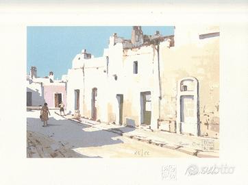 Cartellina Aldo Riso, Rarissima, NERA, contenente 3 litografie originali, con timbro a secco, firma autografa GRAFICA D'ARTE - DESCRIZIONE OPERE LITOGRAFIE, Dimensioni foglio 23x17 cm. originale firmata a matita dall’artista di suo pugno!! TITOLI OPERE DISPONIBILI: Presso Leuca, Presso Ciro', Presso Desenzano. LITOGRAFIE, Dimensioni foglio 23x17 cm, originale firmata a matita dall’artista, tiratura limitata, esemplare numerati in lettere romane. Con Certificato di autenticità! BIOGRAFIA DELL'AUTORE Aldo Riso nasce nel 1927 a Santa Mariadi Leuca, nella provincia di Lecce. Si applica negli studi fino al perseguimento della laurea in Giurisprudenza, ma parallelamente approfondisce, sin da giovanissimo, la conoscenza delle tecniche pittoriche, prediligendo la tecnica dell’acquerello per ritrarre i famosi scorci della sua Puglia e più ingenerale dell’Italia meridionale. Tiene la sua prima mostra nel 1956. Il suo immaginario artistico lo consacra a un notevole successo di mercato che lo porta a esporre oltre che in Italia anche in Germania, Austria, Francia, Grecia, Serbia, Spagna, Canada, Stai Uniti, Messico, Argentina e Sud Africa. Nei primi anni Settanta viene invitato a realizzare una grande opera murale a Ustica e l’amore per quest’isola lo accompagnerà per tutta la vita. La sua ricerca si caratterizza per una pittura chiara, intensa, solare, ove i paesaggi sono inondati dalla luce che solo l’acquerello può rendere nelle sue tipiche trasparenze. Case, barche e pescatori respirano rarefatti e sospesi sotto cieli implacabili e davanti a mari cristallini. Al suo lavoro si interessano importanti firme della critica e famosi personaggi della cultura e dello spettacolo. Le sue opere sono presenti in numerose collezioni pubbliche e private. Aldo Riso muore a Roma nel 2008