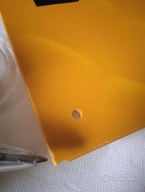 E' di forma quadrata, in plastica rigida gialla con sfumature, scritta centrale "PERICOLO DI MORTE"